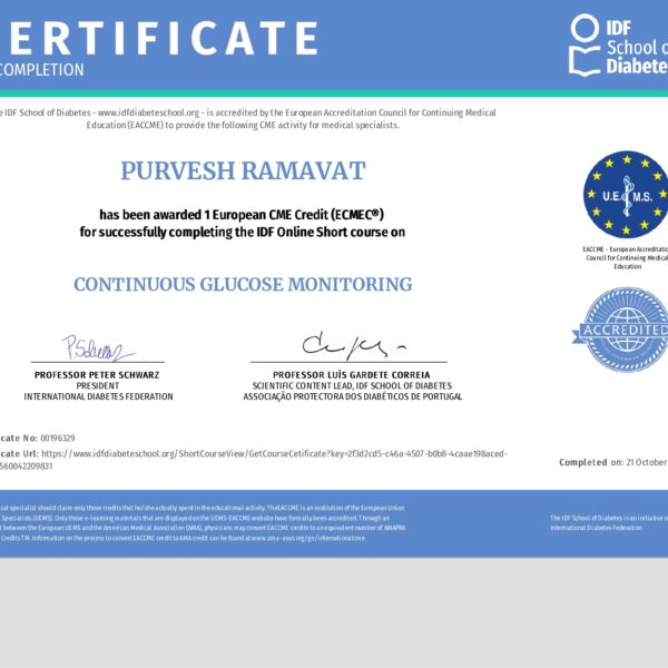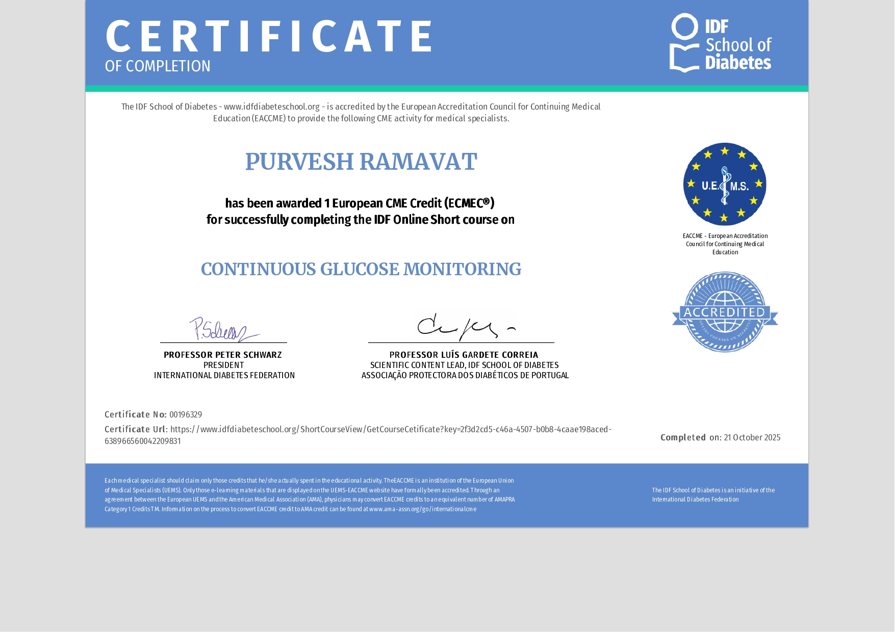 - Completed Fellowship in Diabetes, enhancing expertise in the comprehensive management of diabetes and related metabolic disorders.